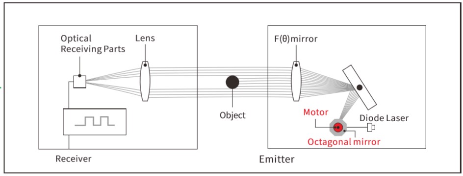 Laser scan micrometer uses a mirror rotating motor inside to strike laser beam, and calculate diameter with the time of laser beam get shadowed by product.